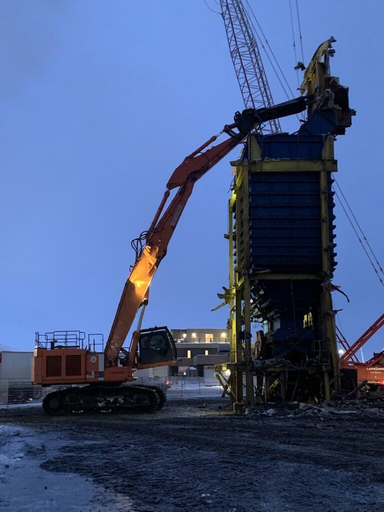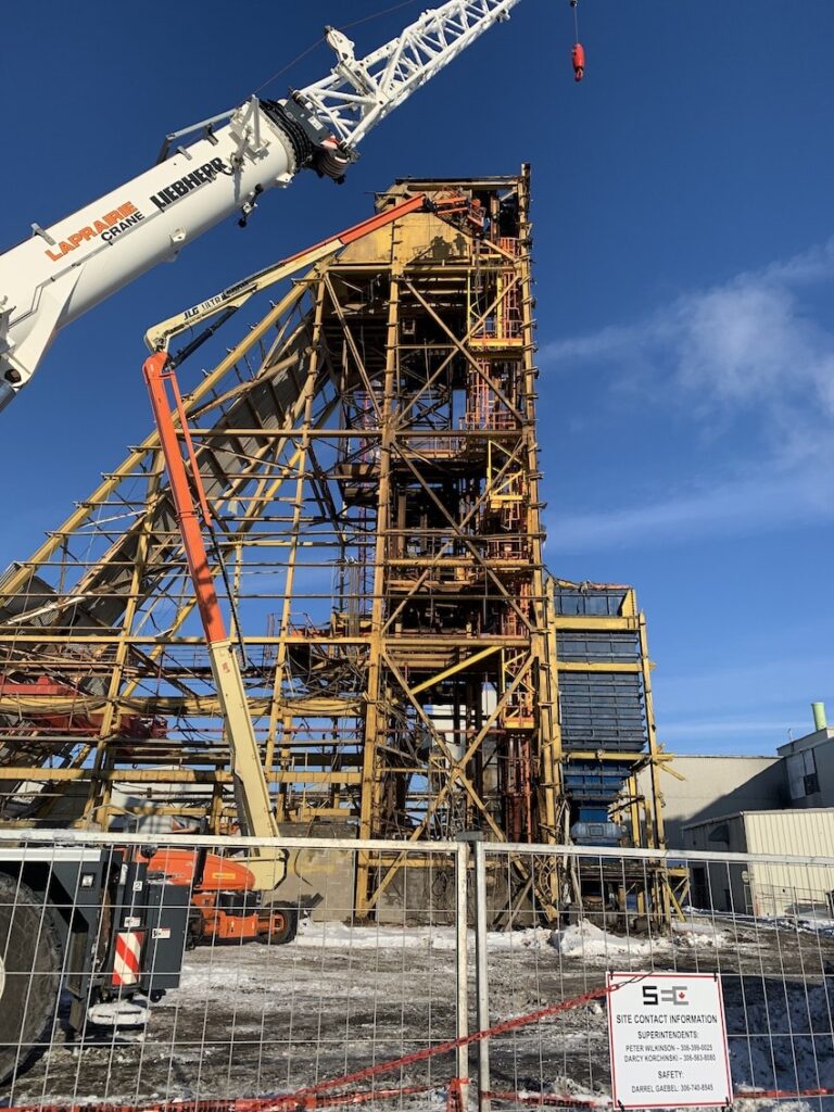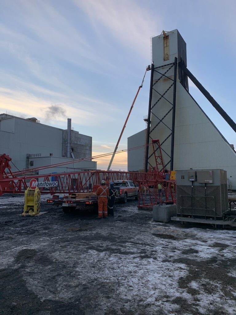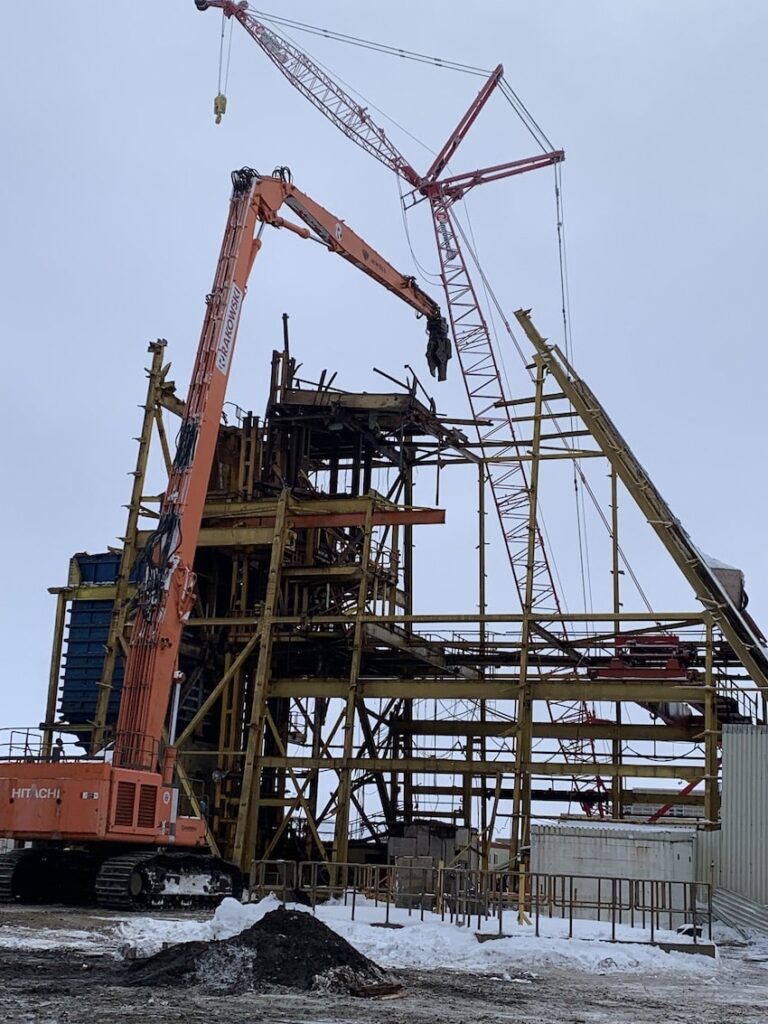In 2022, SEC was awarded the Headframe Demolition project at the Mosaic K1 Mine Site. SEC teamed up with partners LaPrairie Crane & Rakowski Group and battled the winter elements to complete this project incident and injury free. Strategic planning and engineering were a major component to this project which included 6 engineered lift plans and a full engineered demolition plan. All demolished material was sorted, salvaged, and strategically removed from site during the demolition activities providing no disruption to the client’s day to day operations.