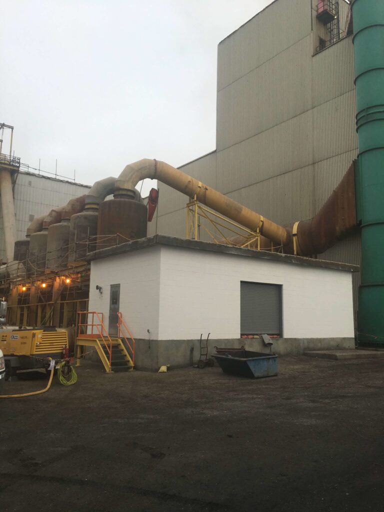 The refurbishment project on a building at a potash facility required the installation of scaffolding crash decks, roof and wall demolitions, replacement and refurbishment of structural steel, asbestos abatement, replacement of girts, cladding, roofing and duct supports.